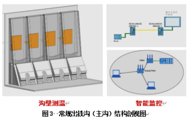 高爐出鐵溝智能監測技術(見下圖3)是shi在zai風feng冷leng技ji術shu的de基ji礎chu上shang於yu永yong久jiu層ceng預yu製zhi件jian背bei襯chen銅tong板ban,安an裝zhuang時shi緊jin貼tie銅tong板ban處chu預yu埋mai熱re電dian偶ou,利li用yong銅tong板ban的de高gao導dao熱re性xing能neng,可ke實shi現xian對dui整zheng個ge預yu製zhi件jian的de襯chen背bei的de溫wen度du變bian化hua監jian測ce。熱re電dian偶ou溫wen度du變bian化hua即ji可ke反fan饋kui該gai預yu製zhi塊kuai所suo對dui應ying部bu位wei的de主zhu溝gou侵qin蝕shi情qing況kuang,通tong過guo溫wen度du信xin息xi采cai集ji與yu出chu鐵tie溝gou結jie構gou導dao熱re模mo型xing,建jian立li數shu值zhi仿fang真zhen侵qin蝕shi模mo型xing並bing與yu真zhen實shi侵qin蝕shi數shu據ju對dui比bi修xiu正zheng,即ji可ke實shi現xian對dui主zhu溝gou溝gou幫bang的de有you效xiao智zhi能neng監jian測ce,對dui溝gou幫bang殘can厚hou的de預yu測ce預yu警jing,降jiang低di燒shao穿chuan的de風feng險xian,減jian小xiao了le鐵tie溝gou燒shao穿chuan事shi故gu的de發fa生sheng。