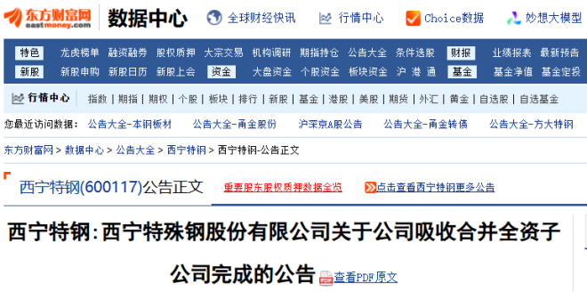 4月3日,西寧特鋼發布了《西寧特殊鋼股份有限公司關於公司吸收合並全資子公司完成的公告》(以下簡稱《公告》)。