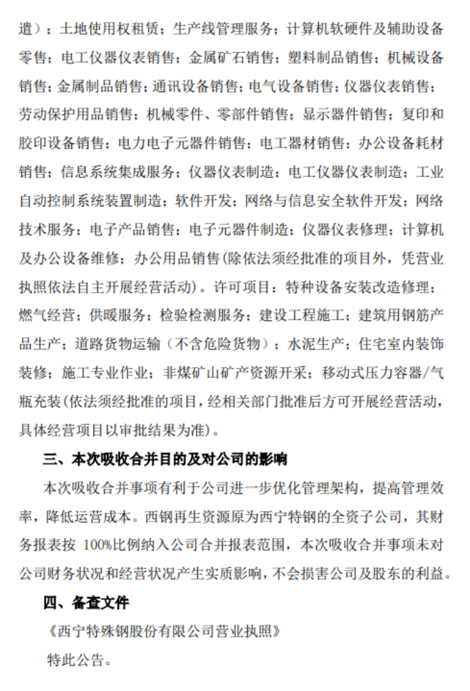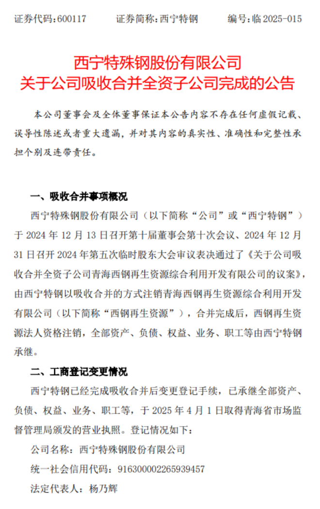 從《公告》中獲悉,西寧特殊鋼股份有限公司於2024年12月13日召開第十屆董事會第十次會議、2024年12月31日召開2024年第五次臨時股東大會審議表決通過了《關於公司吸收合並全資子公司青海西鋼再生資源綜合利用開發有限公司的議案》,由西寧特鋼以吸收合並的方式注銷青海西鋼再生資源綜合利用開發有限公司,合並完成後,西鋼再生資源法人資格注銷,全部資產、負債、權益、業務、職工等由西寧特鋼承繼。