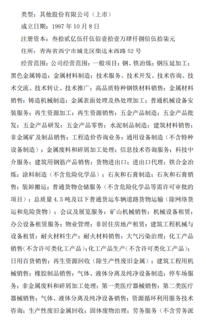 西寧特鋼已經完成吸收合並後變更登記手續,已承繼全部資產、負債、權益、業務、職工等,於2025年4月1日取得青海省市場監督管理局頒發的營業執照。