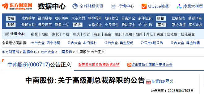 4月2日,廣東中南鋼鐵股份有限公司發布了《關於高級副總裁辭職的公告》。