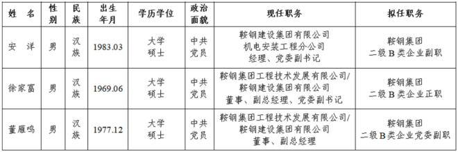 鞍鋼集團有限公司3名擬任職領導人員名單