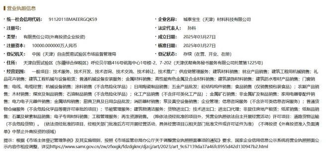 據國家企業信用信息公示係統顯示,城泰寶生(天津)材料科技有限公司已於2025年3月27日成立,法定代表人為孫科,注冊資本為10000萬元,企業注冊地址位於天津自貿試驗區(東疆綜合保稅區)呼倫貝爾路416號銘海中心1號樓-2、7-202(天津優幫商務秘書服務有限公司托管第1225號)。經營範圍包括技術服務、技術開發、供應鏈管理服務、金屬材料銷售、金屬礦石銷售、非金屬礦及製品銷售等多項內容。