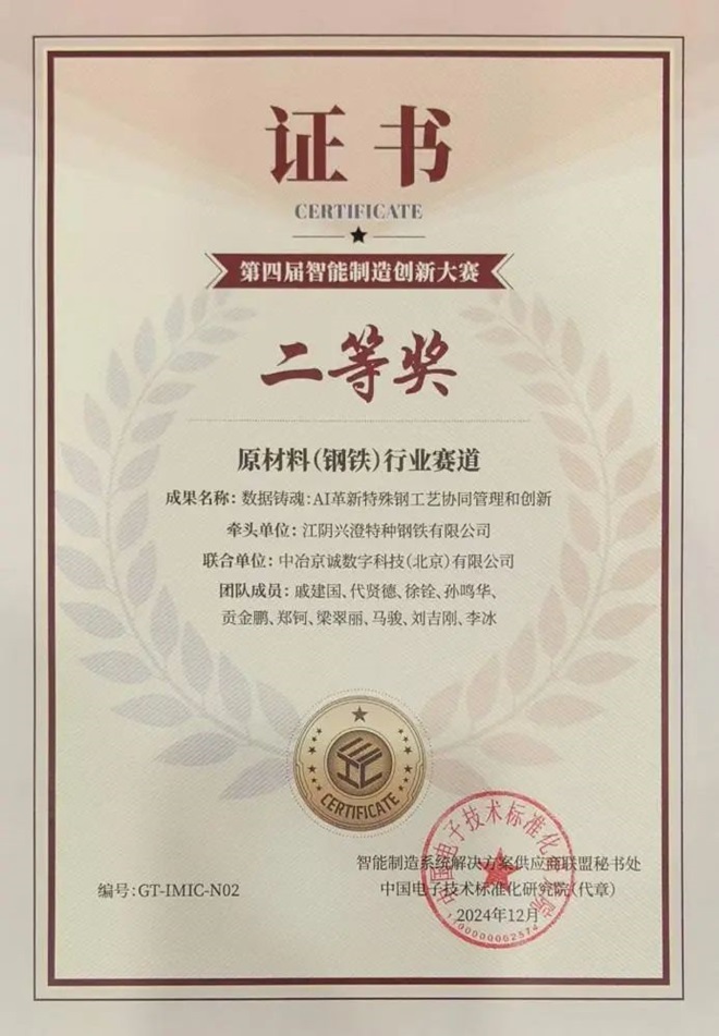 中冶京誠數科公司與江陰興澄特鋼聯合申報的《數據鑄魂:AI革新特殊鋼工藝協同管理和創新》解決方案榮獲第四屆智能製造創新大賽—原材料(鋼鐵)行業賽道決賽二等獎。該方案運用雲計算、物聯網、大數據、AI等(deng)先(xian)進(jin)技(ji)術(shu),構(gou)建(jian)數(shu)據(ju)治(zhi)理(li)與(yu)安(an)全(quan)體(ti)係(xi),打(da)造(zao)特(te)鋼(gang)行(xing)業(ye)數(shu)智(zhi)管(guan)控(kong)中(zhong)心(xin),實(shi)現(xian)了(le)生(sheng)產(chan)過(guo)程(cheng)的(de)實(shi)時(shi)監(jian)控(kong)與(yu)智(zhi)能(neng)調(tiao)度(du),有(you)效(xiao)提(ti)升(sheng)了(le)生(sheng)產(chan)效(xiao)率(lv)和(he)產(chan)品(pin)質(zhi)量(liang),構(gou)建(jian)鋼(gang)鐵(tie)行(xing)業(ye)垂(chui)直(zhi)大(da)模(mo)型(xing),覆(fu)蓋(gai)核(he)心(xin)生(sheng)產(chan)工(gong)序(xu),打(da)造(zao)“鐵、鋼、軋、能、環、研”六位一體智能製造體係。本次獲獎,是江陰興澄特鋼獲得全球特鋼行業首個“燈塔工廠”後(hou)雙(shuang)方(fang)攜(xie)手(shou)合(he)作(zuo)的(de)又(you)一(yi)科(ke)研(yan)碩(shuo)果(guo),是(shi)對(dui)雙(shuang)方(fang)智(zhi)能(neng)製(zhi)造(zao)創(chuang)新(xin)實(shi)踐(jian)的(de)權(quan)威(wei)認(ren)可(ke),未(wei)來(lai)雙(shuang)方(fang)將(jiang)進(jin)一(yi)步(bu)凝(ning)聚(ju)合(he)力(li),為(wei)特(te)殊(shu)鋼(gang)行(xing)業(ye)智(zhi)能(neng)化(hua)轉(zhuan)型(xing)發(fa)展(zhan)持(chi)續(xu)賦(fu)能(neng),攜(xie)手(shou)譜(pu)寫(xie)行(xing)業(ye)高(gao)質(zhi)量(liang)發(fa)展(zhan)新(xin)篇(pian)章(zhang)。