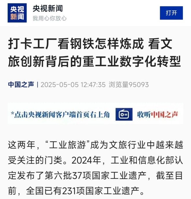 這兩年,“工業旅遊”成為文旅行業中越來越受關注的門類。2024年,工業和信息化部認定發布了第六批37項國家工業遺產,截至目前,全國已有231項國家工業遺產。