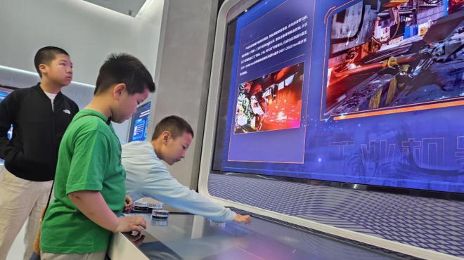記者:在南京鋼鐵集團,參觀者可以與展廳屏幕上的數字員工小南互動交流。