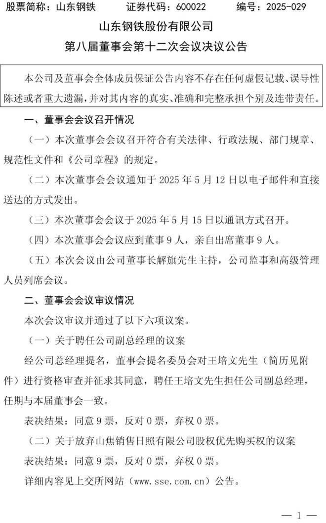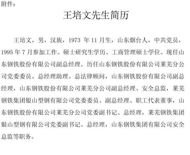 5月16日,山東鋼鐵發布公告稱,公司第八屆董事會第十二次會議審議通過了《關於聘任公司副總經理的議案》,聘任王培文先生擔任公司副總經理,任期與本屆董事會一致。