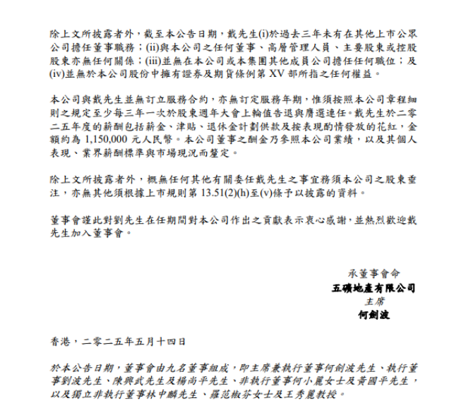 5月14日,五礦地產有限公司發布公告,宣布公司執行董事及董事會委員會成員發生變更。