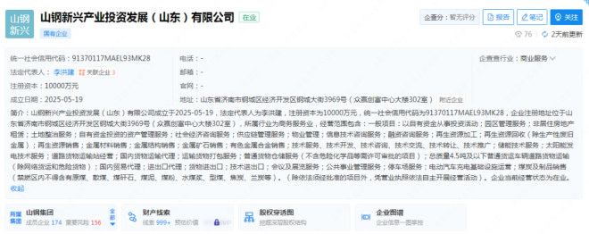 據企查查信息顯示,山鋼新興產業投資發展(山東)有限公司於5月19日成立。法定代表人為李洪建,注冊資本為10000萬元,所屬行業為商務服務業。具體情況如下圖: