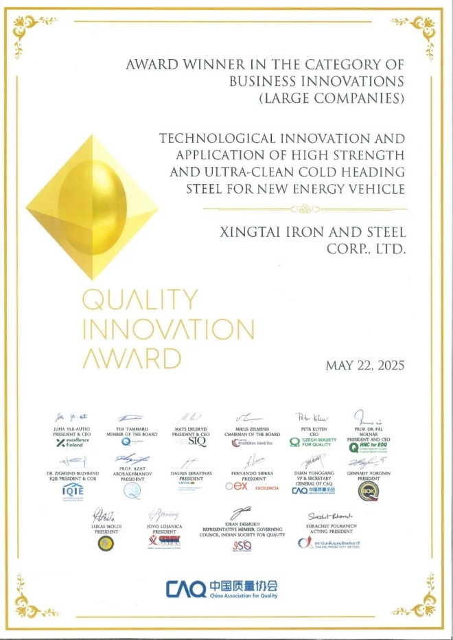 2025年5月22日-23日,2024年國際質量創新大賽發布會暨頒獎儀式在泰國曼穀成功舉辦。在國際舞台上,邢台鋼鐵為行業首摘殊榮:該公司技術研發團隊發布的《新能源汽車用高強度超高潔淨度冷鐓鋼技術創新及應用》項目獲得大賽一等獎,是邢鋼獲得的首個國際大獎,也是自國際質量創新大賽活動舉辦以來,鋼鐵行業首次斬獲的國際大獎。