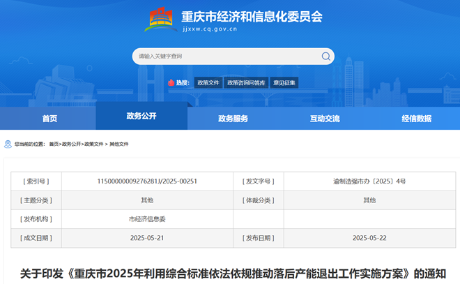 近日,重慶市經濟和信息化委員會網站發布了關於印發《重慶市2025年利用綜合標準依法依規推動落後產能退出工作實施方案》的通知。