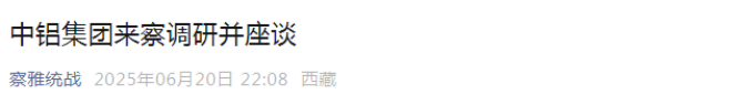 6月20日,察雅統戰公眾號發布了《中鋁集團來察調研並座談》一文。