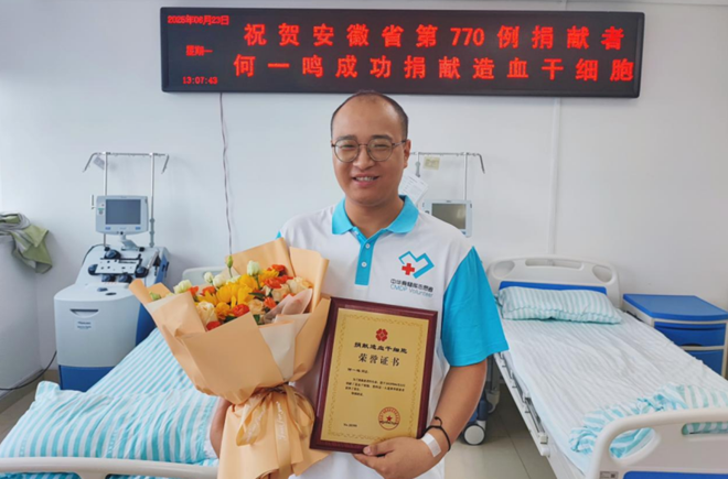 2023年,西安血庫緊缺AB型血,何一鳴在獻血時了解到造血幹細胞捐獻可以挽救血液病患者的生命,但匹配成功率僅有十萬分之一。本著“萬一我的造血幹細胞能救人一命呢?”的想法,他主動報名留取血樣,加入了中華骨髓庫,成為一名造血幹細胞捐獻誌願者。