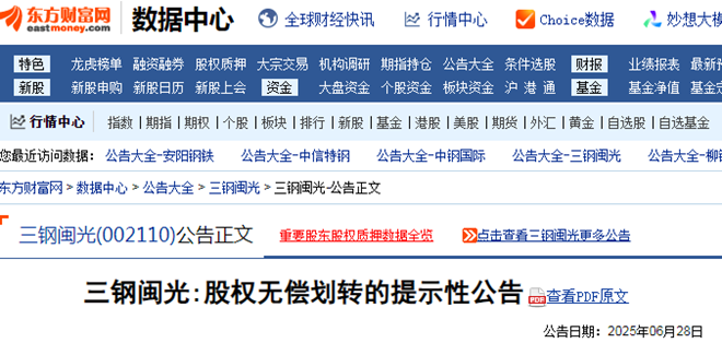 6月28日,三鋼閩光發布了股權無償劃轉的提示性公告(以下簡稱“公告”)。