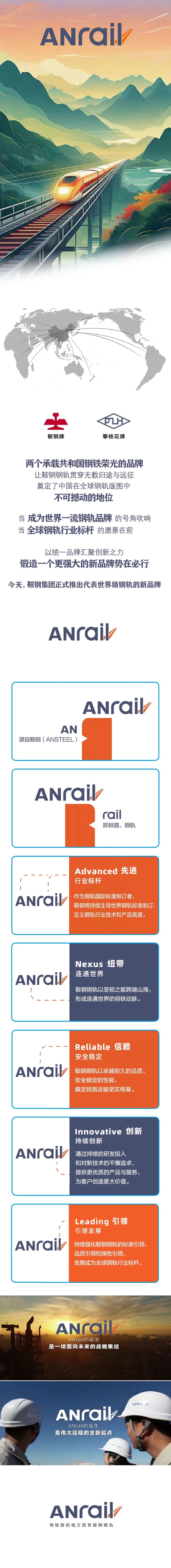 鞍鋼鋼軌品牌ANrail是鞍鋼集團錨定“打造享譽世界的鋼軌品牌”目標,整合旗下“鞍鋼”“攀枝花”兩大鋼軌品牌數十年淬煉的研發生產實力、全球資源和市場聲譽而創建的鞍鋼鋼軌統一品牌。“ANrail”中的“AN”取自鞍鋼英文名稱ANSTEEL,“rail”代表鋼軌,字母A、N、R、I、L分別代表Advanced(行業標杆)、Nexus(連通世界)、Reliable(值得信賴)、Innovative(持續創新)、Leading(引領發展)。