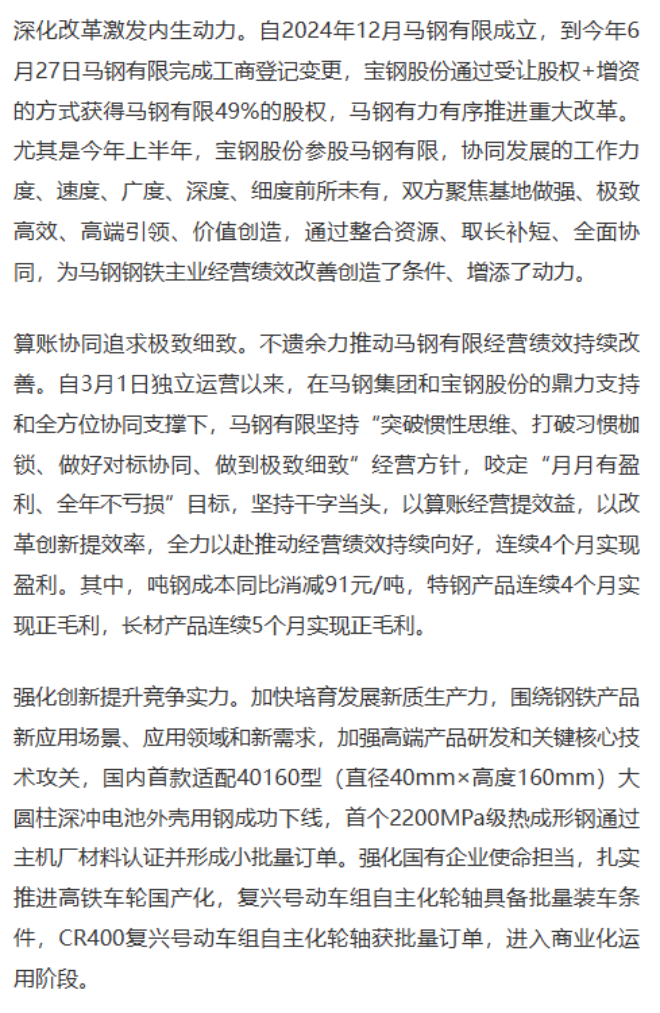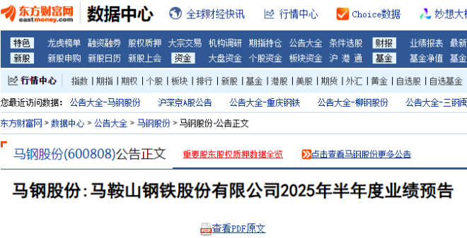 近日,馬鋼股份發布2025年上半年業績預報。報告顯示,馬鋼股份上半年經營績效明顯改善,與上年同期相比,預計增利10.7億元左右。