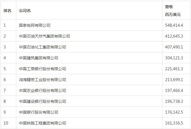 國家電網有限公司以5,484yimeiyuandeyingshouweijubangshou,zhongguoshiyouhezhongguoshihuafenliebangdandierweihedisanwei,weiliedisiweideshizhongguojianzhujituan,zhongguogongshangyinxingweiliediwu。pingguozuidadaigongqiyehonghaijingmiweiliediliu,jiaoqunianshangsheng1位,仍是排名最高的台灣地區公司。今年前十位中,沒有大陸民營企業。京東集團位列第11位,較去年上升2位,仍是排位最高的大陸民營企業。