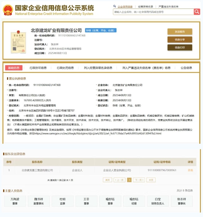 據國家企業信用信息公示係統顯示,北京建龍重工集團有限公司於8月13日成立全資子公司——北京建龍礦業有限責任公司,注冊資本約為16.77億元,由建龍集團100%控股,董事長張誌祥出任新公司董事長。