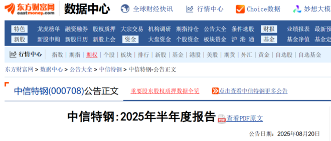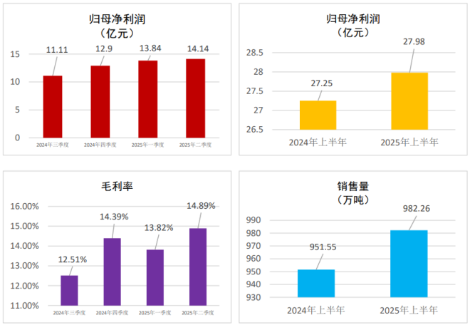 8月20日,中信特鋼發布半年度業績報告。報告顯示,2025 年上半年,該公司實現鋼材銷量 982.26 萬噸,同比增長 3.23%;出口銷量 112.16 萬噸,同比基本持平;營業收入547.15 億元,同比下降 4.02%;毛利率 14.37%,同比增長 2.07 個百分點;歸屬於上市公司股東的淨利潤 27.98 億元, 同比增長 2.67%,經營業績保持行業領先,主要經營指標數據如下: