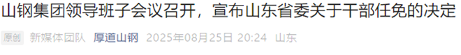 8月25日,山鋼微信公眾號發布了《山鋼集團領導班子會議召開,宣布山東省委關於幹部任免的決定》一文。