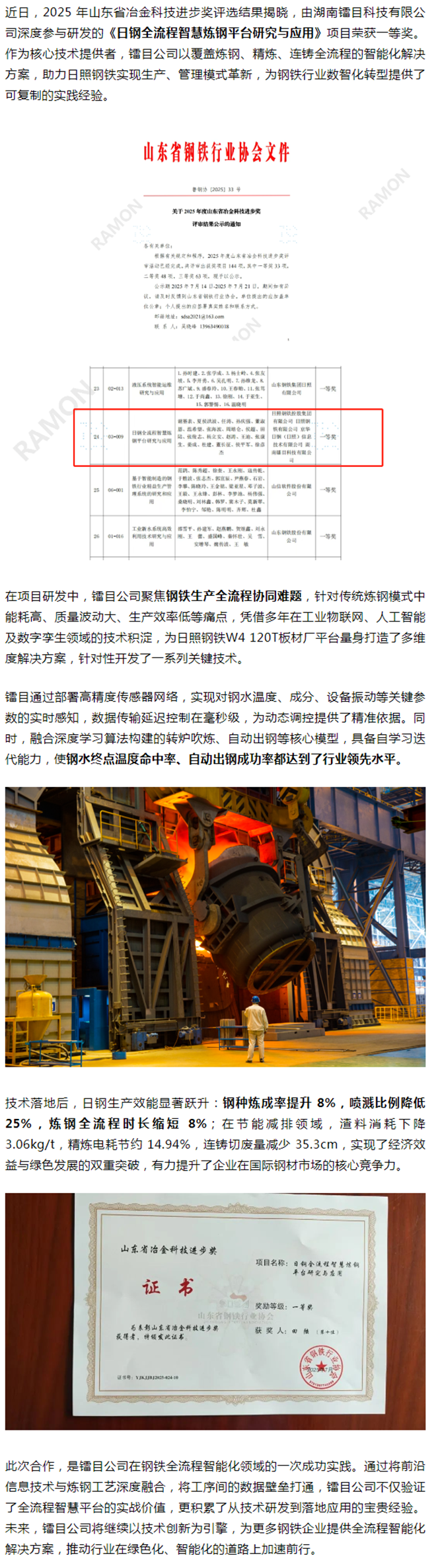 《日鋼全流程智慧煉鋼平台研究與應用》項目榮獲山東省冶金科技進步一等獎