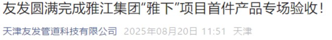 天津友發管道科技有限公司8月20日報道(點擊鏈接查看全文:https://mp.weixin.qq.com/s/FIFRa8ygUa1P4rKrLPtVJg),近日,雅江集團“雅下”項目組領導一行先後蒞臨陝西友發鋼管有限公司、天津友發管道科技有限公司,針對項目所需螺旋防腐保溫鋼管開展首件產品實地驗收工作。經過係統驗收,項目組最終出具結論:友發管道科技承製的“雅下”項目首件產品,關鍵指標全合格、質量文件全合規,首件驗收通過。此次驗收的圓滿完成,標誌“雅下”項目正式進入螺旋防腐保溫鋼管實質供貨階段。