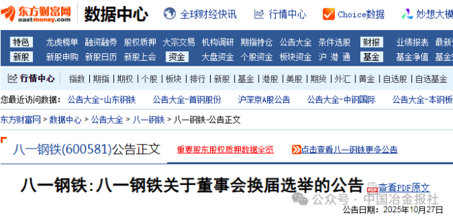 10月27日,八一鋼鐵發布了關於董事會換屆選舉的公告。