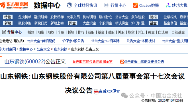 10月25日,山東鋼鐵發布了第八屆董事會第十七次會議決議公告。