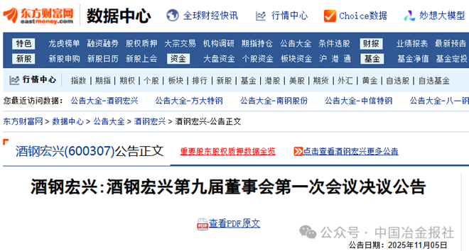 11月5日,酒鋼宏興發布《酒鋼宏興第九屆董事會第一次會議決議公告》(以下簡稱《公告》)。