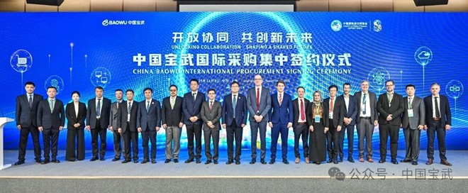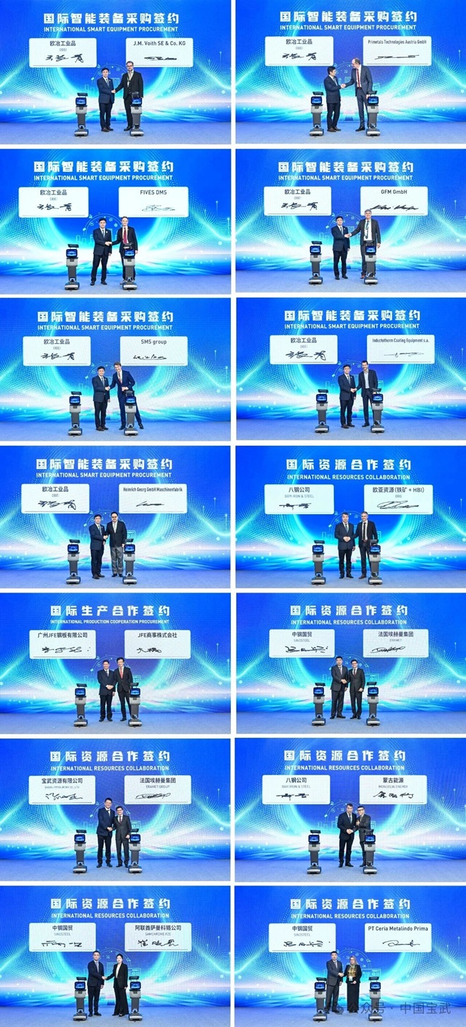 簽約儀式分5個批次進行,覆蓋多元合作領域,成果豐碩。首批簽約聚焦國際智能裝備采購,歐冶工業品與普銳特、法孚、GFM、西馬克等七家全球知名裝備製造商簽署合作協議。隨後進行的國際生產合作簽約中,GJSS與JFE商事株式會社就進一步深化合作達成一致。在備受關注的國際資源合作環節,簽約分三個批次進行,涉及寶武資源、中鋼國貿等寶武旗下子公司,合作夥伴包括法國埃赫曼集團、歐亞資源集團、蒙古能源、阿聯酋薩曼科鉻公司、印尼鎳礦公司等國際知名資源企業。一場場簽約,不僅是一紙紙合同,更是寶武與全球夥伴同向而行、相互成就的堅實步伐,為保障產業鏈供應鏈韌性注入了澎湃動力。