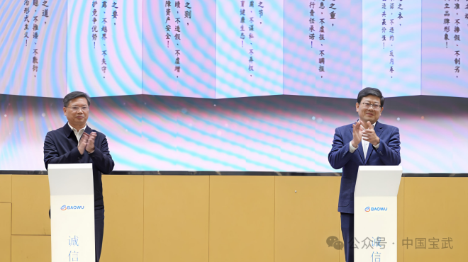 陳國棟要求,要認真學習貫徹習近平總書記關於誠信建設的重要論述和黨的二十屆四中全會精神,把誠信理念融入企業戰略、嵌入企業管理、轉化為行動自覺,確保習近平總書記和黨中央關於誠信建設的決策部署在企業落地生根、結出碩果。陳國棟表示,近年來,國務院國資委黨委深入學習貫徹習近平文化思想,將誠信建設納入國資央企重要議事日程。寶武發起“誠信寶武”倡議,將“誠信”奉為企業核心價值觀的靈魂,作為“一把手”工程高位推動,展現了中央企業的責任擔當;探索形成的“誠信+管理”寶武模式,實現了誠信理念與經營管理的全鏈條、深層次融合。希望寶武深化誠信文化建設,鑄牢對黨忠誠,在擁護“兩個確立”中彰顯誠信擔當;鮮明價值導向,在牢記“國之大者”中引領誠信風尚;融入公司治理,在規範運營中築牢誠信堤壩;堅持品牌引領,在走向世界中閃耀誠信價值。同時勇擔使命責任,弘揚誠信文化,加快打造“誠信寶武”,以文化強企加快建設世界一流企業,用誠信為強國建設、民族複興偉業鑄就永不生鏽的鋼鐵脊梁。