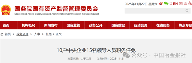 11月21日,國務院國有資產監督管理委員會官網發布了《10戶中央企業15名領導人員職務任免》一文。