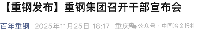 據公眾號百年重鋼最新發布,11月25日,重鋼集團召開幹部宣布會。中國寶武對重鋼集團領導班子作調整。中國寶武黨委常委、總會計師李麗娜視頻出席會議並講話。