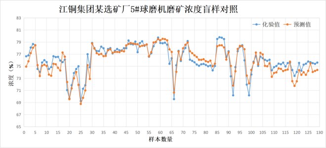 目前,產品已成功落地江銅集團某選礦廠、首鋼集團某選礦廠等行業標杆企業。在江銅選礦廠的長期運行數據跟蹤中,通過采集117組盲樣進行誤差分析顯示:樣本覆蓋濃度範圍的化驗區間為69.25%~79.8%,預測區間為68.77%~79.54%,盲樣總體標準偏差達1.51%,在線預測值與化驗值相關性良好(R^2=0.83)。江銅集團某冶煉廠、晉南礦業某選礦廠等合作項目也在穩步推進,未來將為更多企業的磨礦工藝升級提供技術支撐。