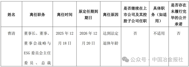 公司第七屆董事會董事長曹清先生因達到法定退休年齡不再擔任第七屆董事會董事長、董事、董事會戰略與 ESG 委員會主任委員、公司總裁等職務,離任後不再擔任公司其他職務,其離任報告自送達董事會之日起生效。