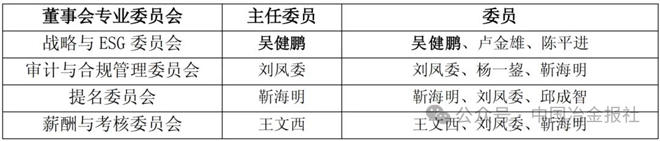吳健鵬先生經公司股東會選舉成為公司非獨立董事後,將同時擔任公司第七屆董事會戰略與 ESG 委員會委員、主任委員,任期自公司股東會審議通過之日起至第七屆董事會任期屆滿之日止。調整後公司第七屆董事會專門委員會組成情況如下(調整人員以黑色加粗字體體現):