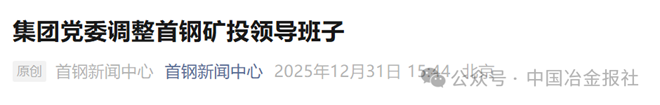 2025年12月31日,據首鋼新聞中心公眾號文章內容顯示:首鋼集團黨委於2025年12月30日召開首鋼礦投幹部大會,宣布了領導人員職務調整的決定。