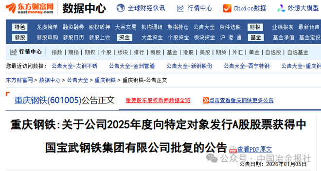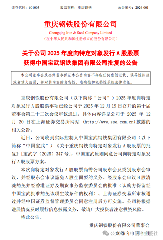 2026年1月5日,重慶鋼鐵發布《關於公司2025年度向特定對象發行A股股票獲得中國寶武鋼鐵集團有限公司批複的公告》(以下簡稱《公告》)。