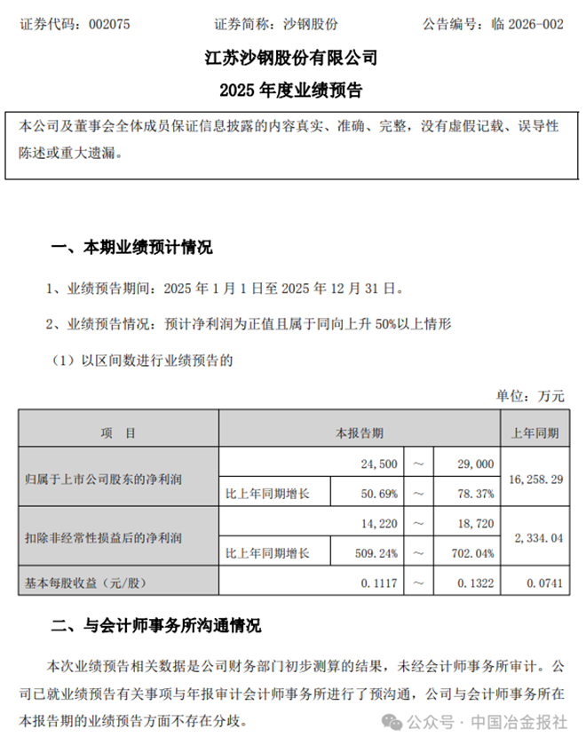 1月24日,沙鋼股份發布《2025年度業績預告》(以下簡稱《預告》)。