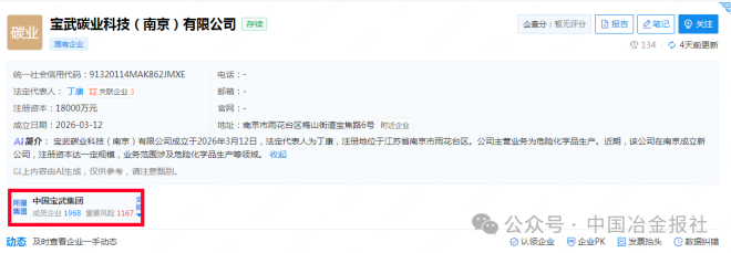 企查查官網顯示,寶武碳業科技(南京)有限公司於2026年3月12日成立,注冊資本為18000萬元,法定代表人為丁康,所屬集團為中國寶武集團。