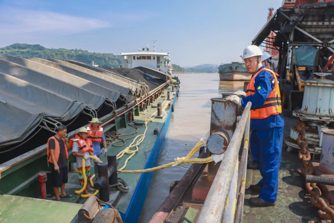 此時,滿載煤炭的“重輪11”號貨輪正頂著洶湧的洪峰逆流,向一碼頭躉船靠檔滑來,洪水淹沒了“重輪11”號最高吃水線,情況危急,重慶鋼立即啟動應急預案,全力以赴用最快速度做好纜頭等靠檔設施檢查確認,在船方精心操控和重慶鋼碼頭人員的專業操作下,“重輪11號”順利靠上了一號碼頭躉船。