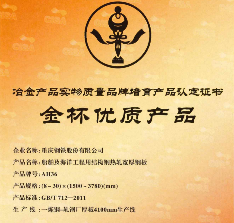 近日,重慶鋼鐵“船舶及海洋工程用結構鋼熱軋寬厚鋼板AH36”產品獲得2023年冶金產品實物質量品牌培育“金杯優質產品”稱號,這是重慶鋼鐵融入中國寶武後斬獲的第6個“金杯優質產品”稱號。