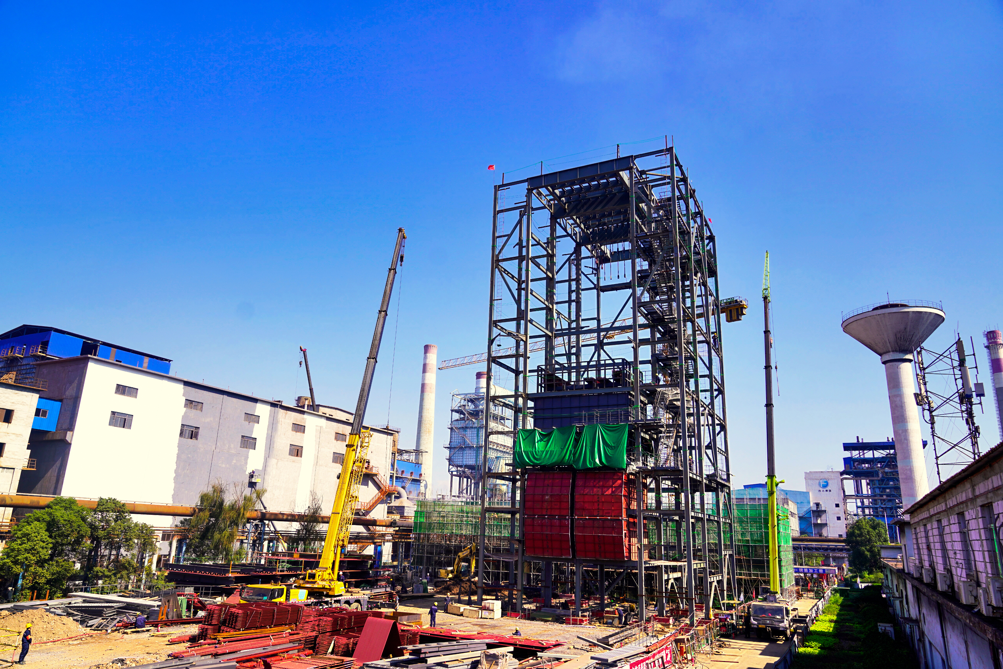 10月23日,蔚藍天空下,方大九鋼80兆瓦超高溫亞臨界煤氣發電工程項目建設現場一派繁忙景象,巨大的吊機正在吊裝鍋爐省煤器,架子工、焊接工等工種穿梭在各個工作崗位,鍋爐主體設備的安裝工作如火如荼。