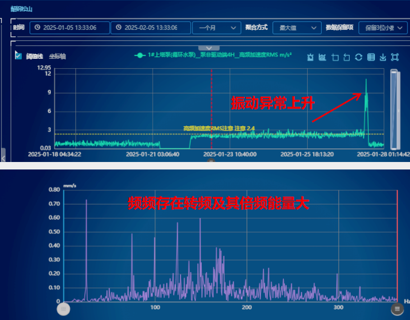 1月27日,智能運維係統監測到煉鐵廠1#上塔泵(循環水泵)自由端振動加速突增,係統提示“聯軸器工況異常,建議檢查密封狀態”。經現場排查,確認該泵自由端密封失效導致漏水,生產單元迅速啟用備機,避免故障擴大引發連鎖反應。因係統精準鎖定故障源頭,助力實現“零停機切換”,減少維修成本及產能損失10萬元。