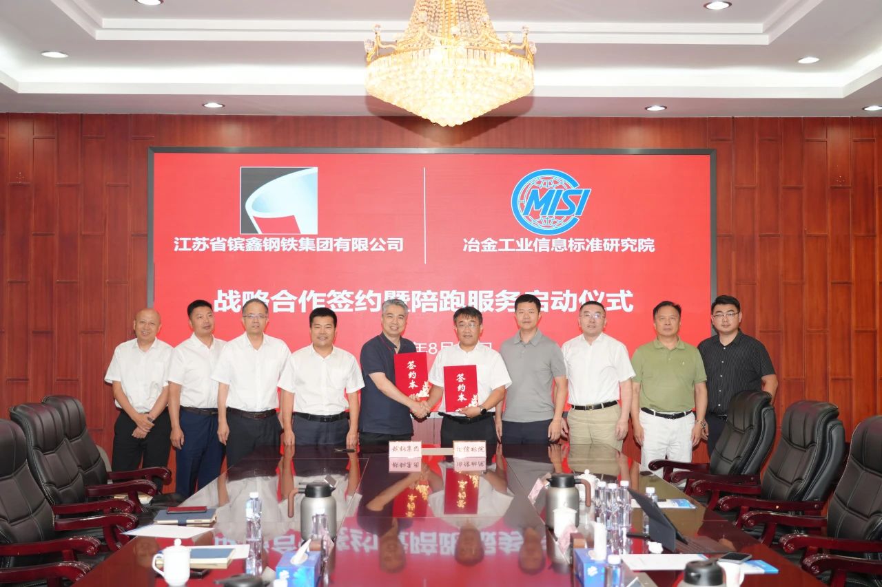 8月11日,江蘇省镔鑫鋼鐵集團有限公司(以下簡稱:镔鋼集團)與冶金工業信息標準研究院(以下簡稱:信息標準院)戰略合作協議簽署暨陪跑服務啟動儀式在北京舉行。此次戰略合作旨在深挖雙方優勢、潛力,充分發揮標準、品牌、信息、谘詢的引領和支撐作用,加快推進镔鋼集團鋼鐵產業高端化、智能化、綠色化,推動镔鋼集團更高質量發展。