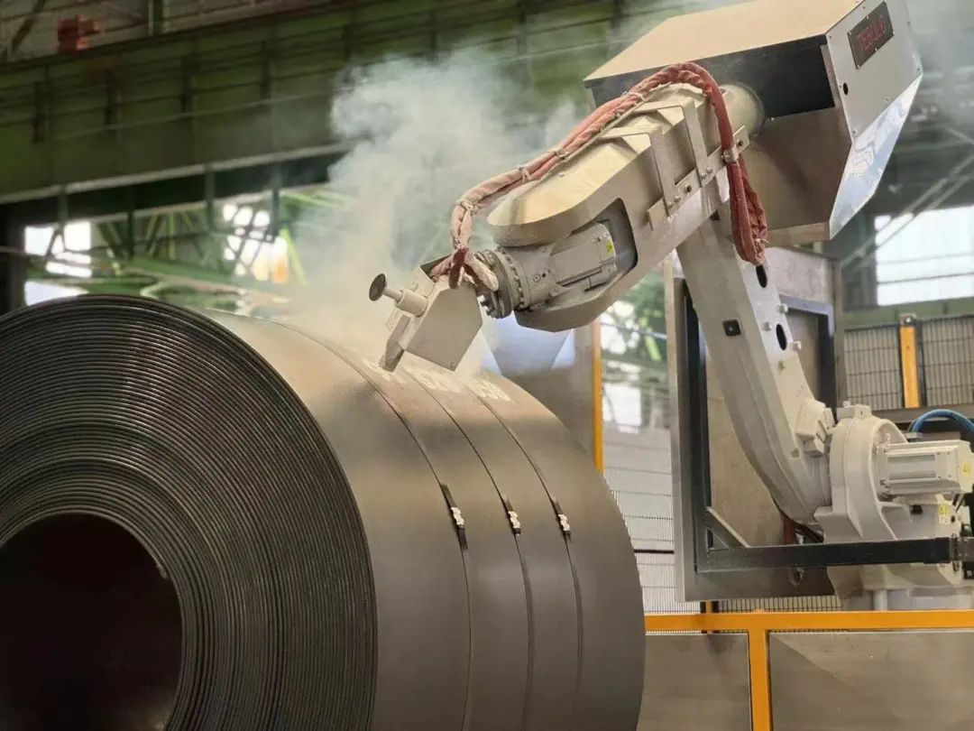 “以前需要在剛下線的滾燙鋼卷旁手動噴印,高溫環境、勞動強度大不說,還容易出錯。”操作工對過去的人工噴印記憶猶新。如今,智能噴印機器人已成為產線上的新晉“工匠”。無論是高溫炙烤下的熱噴印,還是冷卻後的平整冷噴印,搭載穩定機械臂的機器人,都能在滾燙或冰冷的鋼卷表麵,精準、清晰、持久地烙印下鋼卷號、規格、爐號等關鍵信息。這不僅極大提升了效率,解放了人力,更構築起質量追溯與高效流通的堅實基石。每一個清晰無誤的烙印,都是鋼卷獨一無二的“數字身份證”,為後續的分揀、倉儲、運輸乃至客戶使用,提供了全程可追溯、可管理的可靠信息保障。