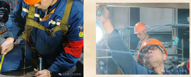測量工作是設備安裝的“標尺”,容不得半點偏差。黃劍濤拿著尺子,俯身專注於定位尺寸測量。他反複核對數據,以“毫厘之爭”守護設備運行精度。