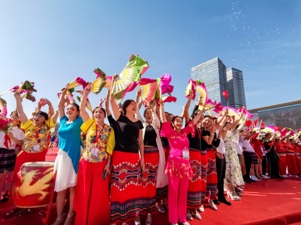 活動現場國旗飄揚、彩旗揮舞,五顏六色的氣球飄揚天空,和平鴿飛向藍天,大家用鏗鏘的鼓聲、歡快的舞姿、嘹亮的歌聲,飽含深情,盡情抒發對偉大的黨、偉大祖國的熱愛和對美好生活的讚美。