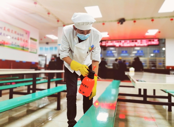 食堂工作人員正在進行消毒