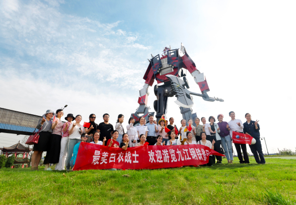 綠草如茵的最美岸線上,巨型鋼鐵機器人“長江守護俠”吸引了白衣天使們的目光,“這個鋼鐵機器人比想象中還要壯觀,真的太棒了!”導遊彭聲彬介紹,“長江守護俠”高9米,寬8米,重4噸,是企業員工利用廢舊鋼板、輪胎等物資製作完成,寓意守護長江一岸翠綠與一江春水,彰顯出方大九鋼人守護長江的堅定意誌。“鋼鐵工人好厲害!”“我們來和鋼鐵俠合影吧!”哢嚓哢嚓的快門聲中,歡聲笑語回蕩在最美岸線上。